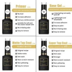- Inhoud verpakking: Primer, Base gel (basecoat), Super Top Coat, Matte Top Gel (topcoat)