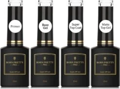 - Inhoud verpakking: Primer, Base gel (basecoat), Super Top Coat, Matte Top Gel (topcoat)