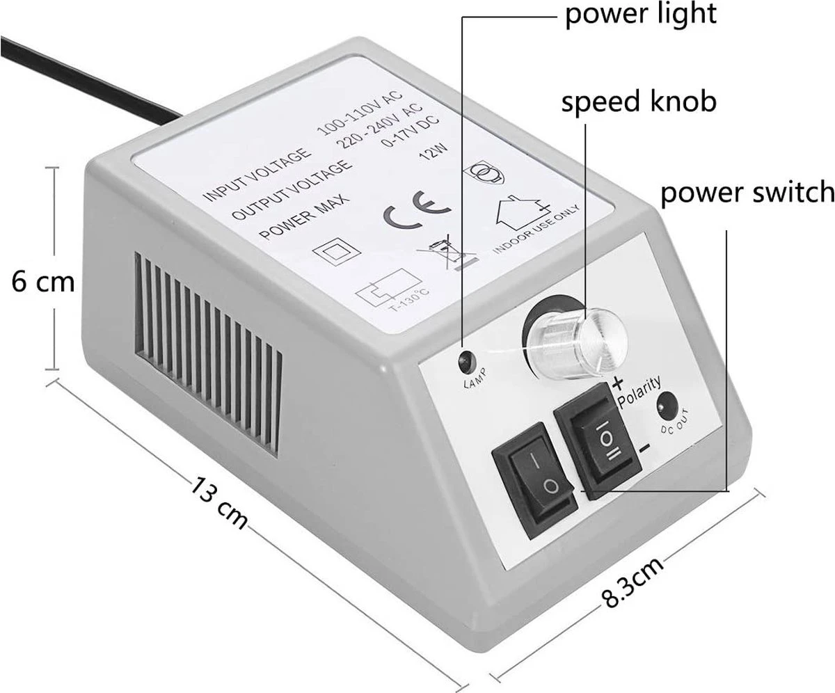 - Instelbare snelheid: de snelheid van de nagelboor kan worden ingesteld van 2.000 tpm tot 20.000 tpm. De vijl kan met de bedieningsschakelaar in verschillende richtingen worden gedraaid.