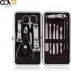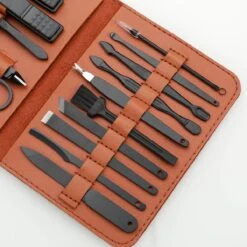- Handverzorging (kleine nagelknippers, schuine nagelknippers, nagelriemtang, dubbele nagelreiniger, nagelvijl, dode huid vork, snijmes); voetverzorging (grotere nagelknippers, plat pedicure mes, schuine voet pedicure mes); gezichtsverzorging (wenkbrauwschaar, wenkbrauwpincet, oorplekken, acne kom naalden, acne naalden); reinigingsborstel