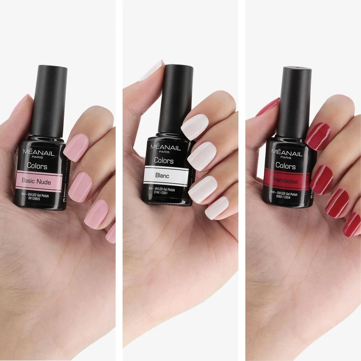 - 3 flesjes gelnagellak (5ml) : framboos, nude, wit