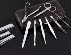 De 12-delige manicure en pedicureset in een prachtige opbergetui. De accessoires zijn vervaardigd uit roestvrij staal, voelen zeer degelijk aan en zijn ideaal voor iedereen die thuis of op vakantie een manicure of pedicure wil toepassen. Reisset Nagelverzorging Set Voor Manicure & Pedicure