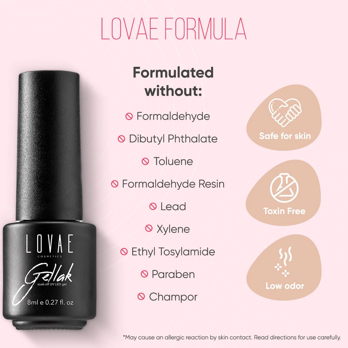 Wil jij ook mooie langhoudende nagels? En ben je normale lak helemaal zat? Ontdek dan de gellak van Lovae cosmetics. Lak. Droog. Versier. Met de unieke formule ben je verzekerd op het hebben van een prachtige uitstraling en briljante hold. Geurvrij. Door de samenstelling hard de lak gemakkelijk uit en plakt deze niet. Hierdoor zijn jouw nagels in een handomdraai perfect gelakt tot wel 2 weken lang. Zo zie er altijd op je best uit en ontvang onopgemerkt de aandacht met Lovae.