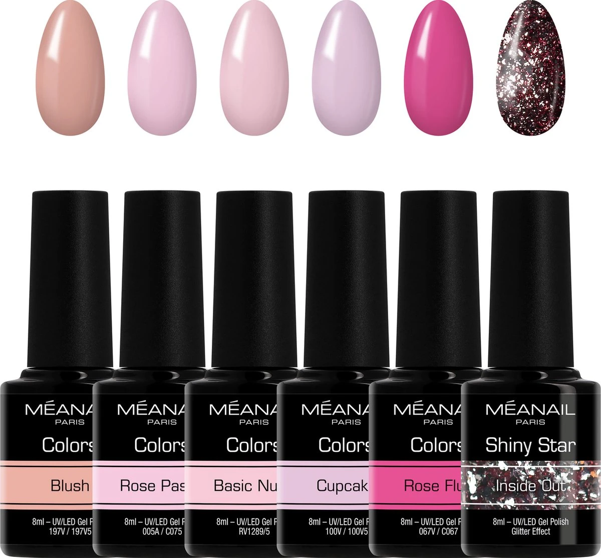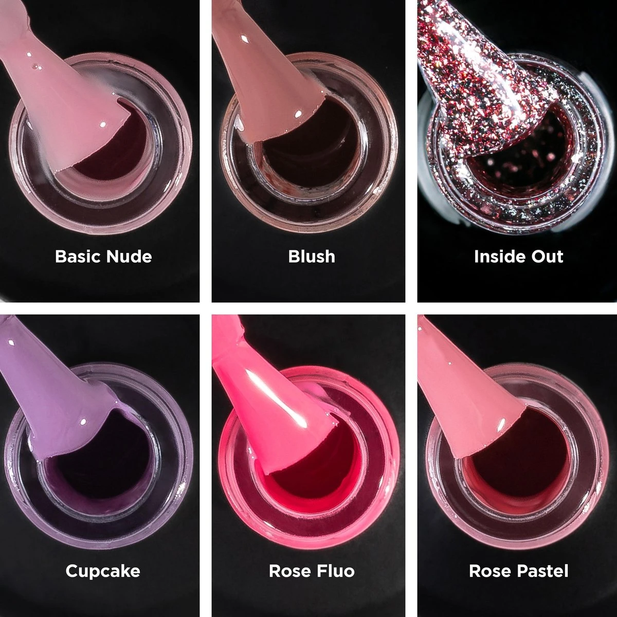 In deze mooie doos vind je 6 gellakjes van 8ml: Basic Nude, Blush, Inside Out, Cupcake, Rose Fluo & Rose Pastel