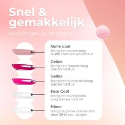 Breng eerst je primer, basecoat en gellak aan zoals je dat gewend bent. Zodra de gellak is uitgehard, is het tijd om de matte top coat aan te brengen. Breng steeds een dun laagje aan die je uithardt onder de UV-lamp. Deze no-wipe top coat hoeft niet te worden afgenomen na het uitharden en geeft direct een matte finish.