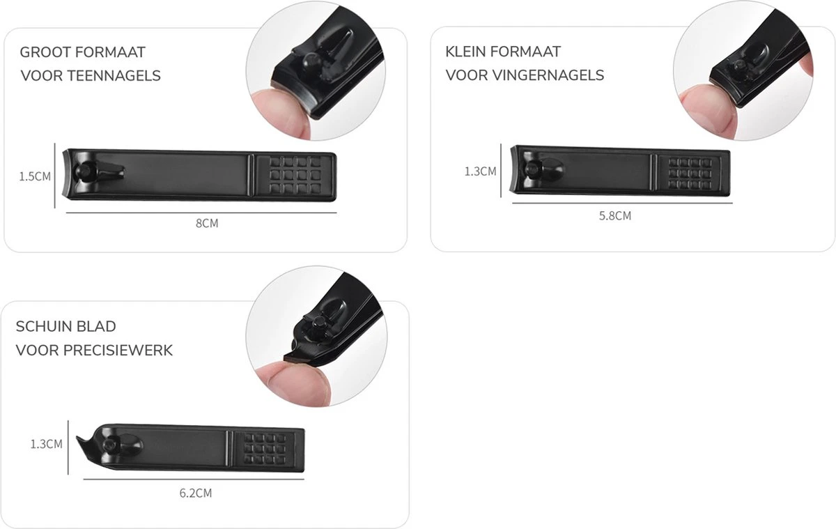 - Set van 3 nagelknippers: een grote nagelknipper voor de teennagels, een kleine voor de vingernagels en een schuine kant voor precisiewerk.